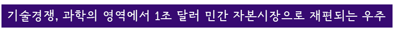 미?소냉전 시대에는 국가 전략 차원에서 막대한 예산이 투입되며 우주 경쟁이 시작됐습니다. 그러나 냉전이 종식되면서 과거 같은 규모의 세금을 투입할 명분이 약화되면서 자연스럽게 우주개발의 중심은 점차 자금 흐름이 보다 유연한 민간 영역으로 이동하게 된 것입니다.