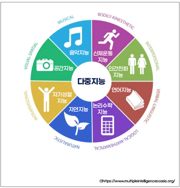 하워드 가드너 교수는 IQ검사가 유행하던 시절, 지능은 특정 문화나 사회 속에서 중요한 문제를 해결하거나 업적을 산출하는 능력으로, 종래의 IQ와는 아주 다른 능력이라고 강조했습니다. 그러면서 지능에는 최소한 여덟 가지의 ‘다중지능’의 개념을 제시했는데요. 중요한 것은 개인들 각각이 서로 다른 지능의 강점이 있고, 하나의 지능이 우수하다는 것이 다른 지능의 강점이나 약점이 되지 않는다는 것입니다. 잘하는 방식이 다를 뿐 모두에게 지능은 다양하게 존재한다는 관점을 강조했습니다.